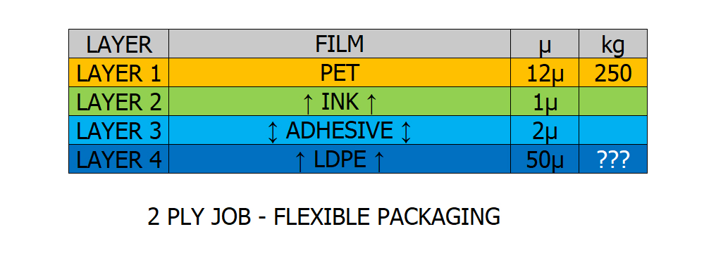 1st Layer – 12µ Pet Density 1.42nd Layer – 50µ LDPE/Poly (Natural) Density 0.93 How much 2nd Layer required for 250 kg Pet ? 2nd Layer gsm x…